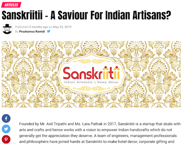 Startup Stories – May 23, 2019Sanskriitii – A Saviour For Indian Artisans? Founded by Mr. Anil Tripathi and Ms. Lata Pathak in 2017, Sanskriitii is a startup that deals with arts and crafts and hence works with a vision to empower Indian handicrafts which do not generally get the appreciation they deserve